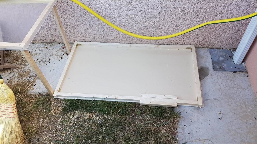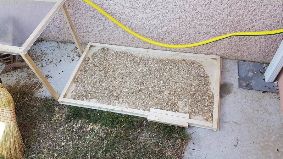 le bas de la cage repose sur une plaque plastique pour pas pourrir la dalle en beton avec le pipi.