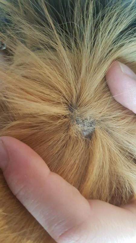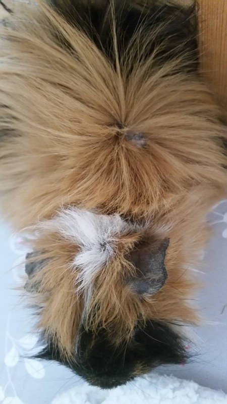 Domino avait eu la gale du cochon d'inde, c'était principalement sur le popotin et derrière les oreilles. Mais c'tait monté très vite, c'était très impressionnant, il n'avait plus de poil à l'arrière et des trous partout, le poil qui partait par touffe.