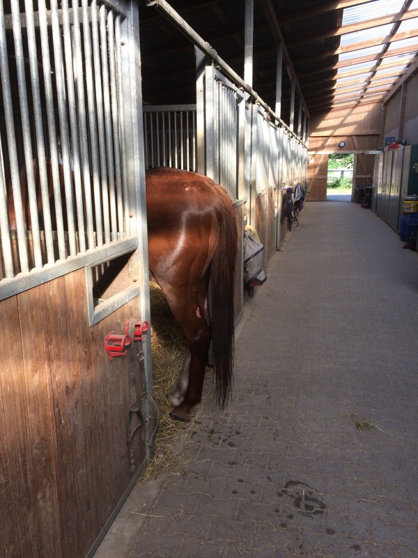 Je l'avais attaché dans le box, en laissant la porte ouverte, je le laisse 30 secondes pour récupérer je sais plus quoi, et quand je reviens il y a une paire de fesses qui m'attend...