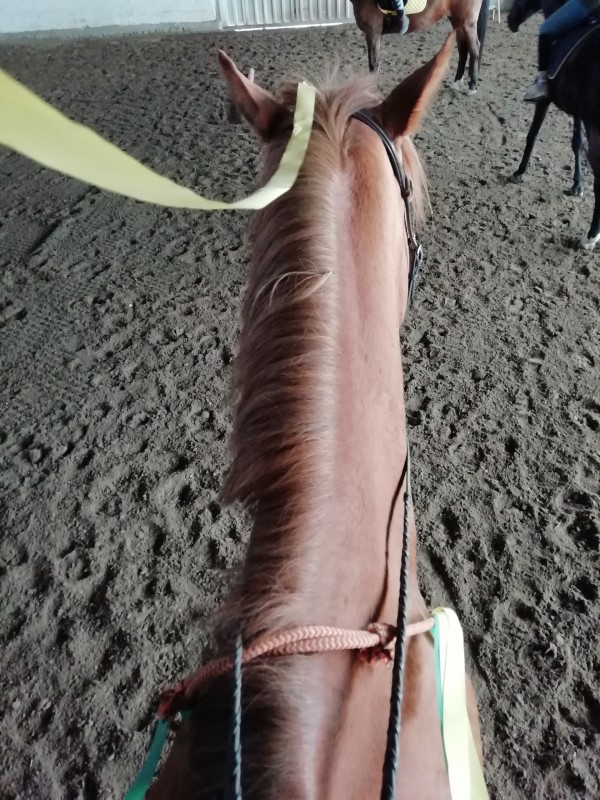 Aujourd'hui je suis à nouveau montée. C'était bof aussi mais je crois que c'est le mors. J'ai voulu tester un mors aiguille que j'avais en stock et c'est pas concluant. On va repasser sur le Sprenger.