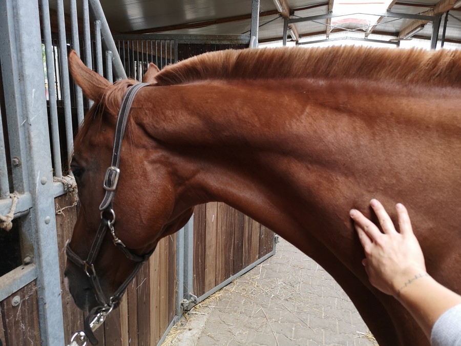 Même il s'appuie contre le doigt pour augmenter la pression sur le muscle et tend toute l'encolure à chaque fois. Ça lui fait une de ces allures
