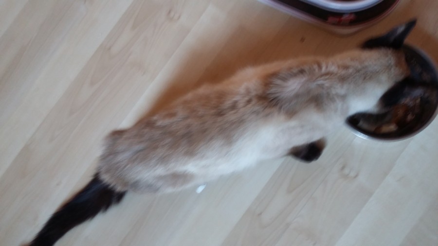 Elle reprend du poil de la ête. Elle mange énormément et que de la pâté ou de la mousse de canard pour les cachets.