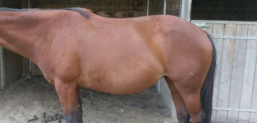 Jusqu'a ce matin où ma coach me fait venir car elle commence à se demander si la jument n'est pas pleine.. Effectivement (je vais vous mettre des photos) les mamelles sont bien gonflées par rapport à d'habitude et le ventre a une forme assez bizarre que je n'avais pas remarquée jusqu'à présent. En me montrant ça, ma coach m'a fait repenser qu'il y a une semaine j'avais vu ses mamelles gonflées et j'ai pensé à une piqûre d'insecte donc ça ne m'a pas alerté.