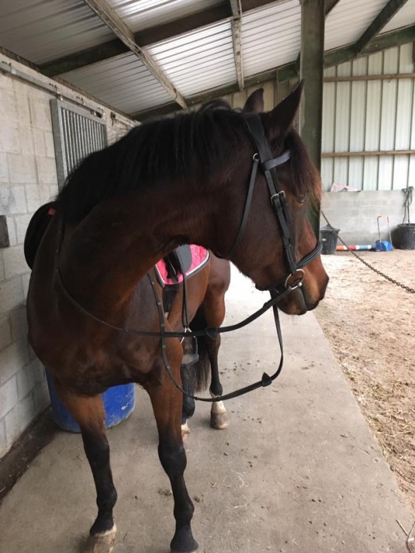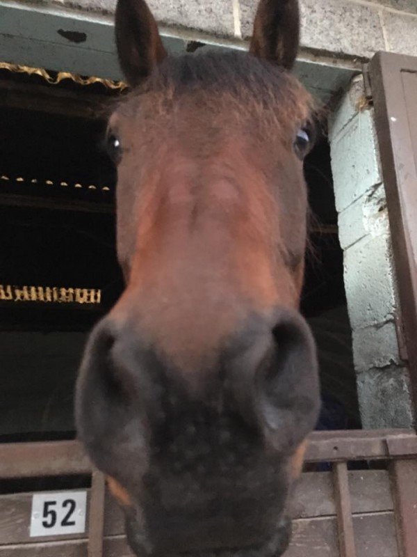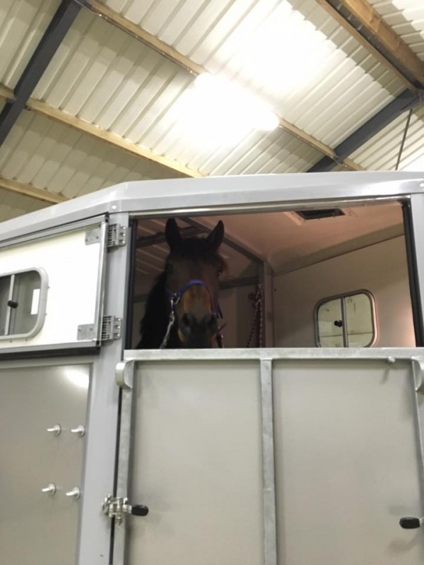 Je tombe face à face avec un cheval doté d'un calme inimaginable, très doux et tranquille à la sortie du boxe et à l'attache, ainsi qu'à la préparation.