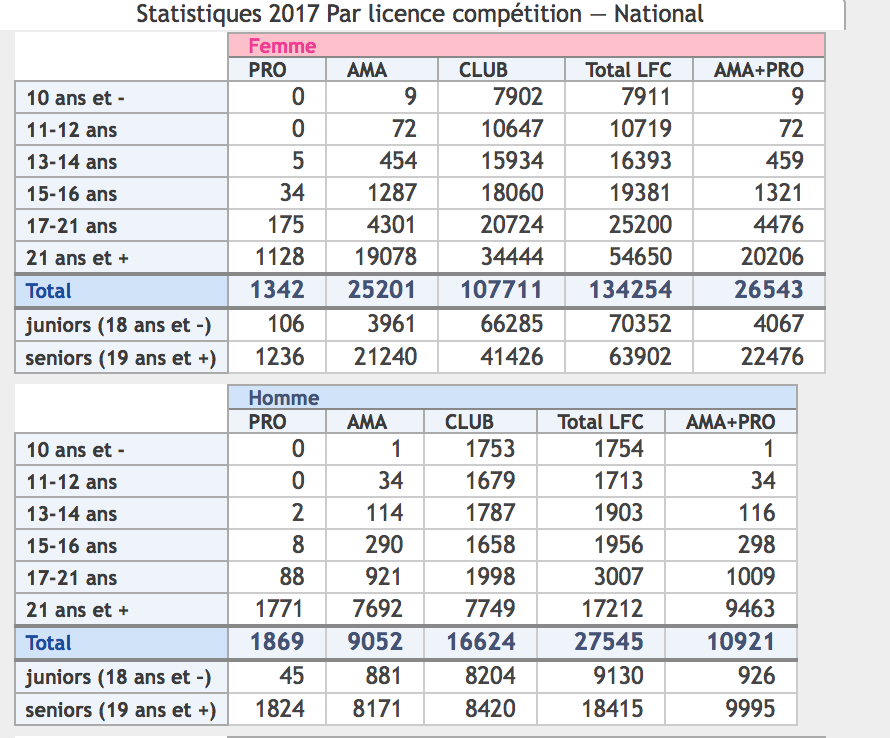 On voit que entre 13 et 21 ans les femmes sont plus impliquées que les hommes dans les compétitions pro. A partir de 19-21 ans, c'est l'inverse les hommes sont majoritaires (50% de plus).