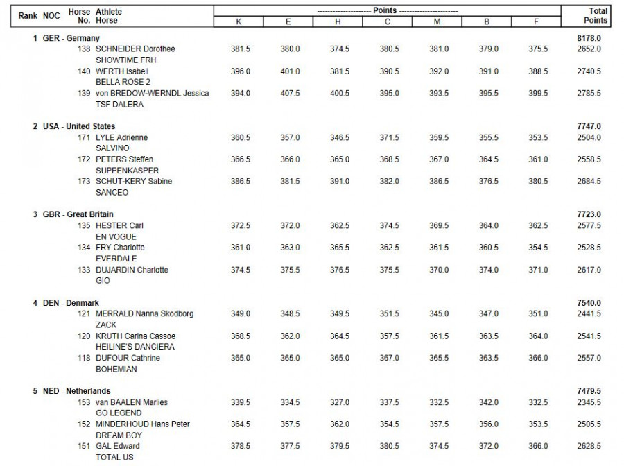 La Kür va être passionnante ! Sanceo va-t-il réitérer et prendre le bronze ? On ne sait même pas à quoi sa reprise ressemble ! Si Bohemian est en bonne forme demain, on se retrouve avec 5 couples pour 3 médailles, voire 3 couples pour le bronze dans la logique des choses. Jamais vu un tel suspens en dressage.