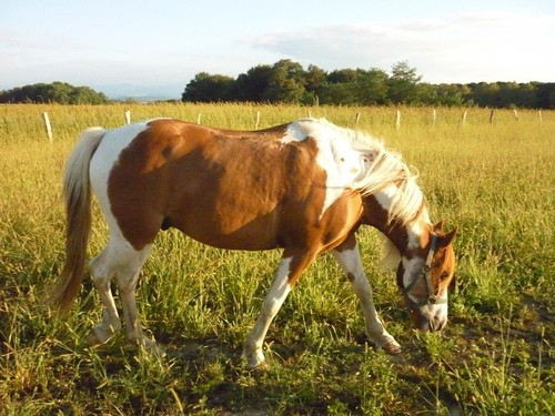 Elle vit toute l'année au pré ou l'herbe est très très riche !!! J'ai donc eu l'idée de réduire la surface de son pré à 400m2 ( à peu près) ou elle est avec un copain (sans complément ni foin en plus). Maintenant sa fait 3 semaine qu'elle y est et je trouve qu'elle a déjà perdu un peu