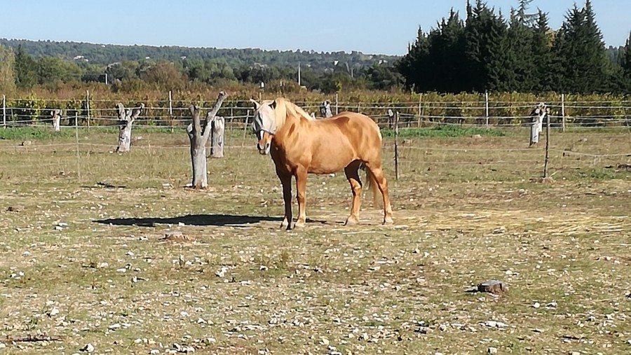 De retour au pré, avec son panier Albert commence à redurcir des flancs... et du chignon (étonnamment le chignon est mou en haut et milieu d'encolure et plus dur vers le bas)