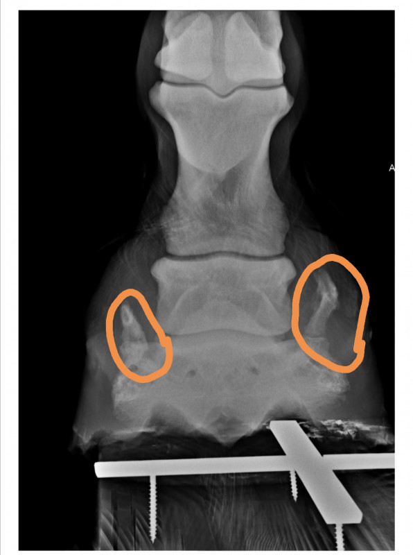 J'ai entouré les ossifications. Quand il fait des cercles serrés ou qu'il est en terrain instable qui le fait basculer le pied latéralement, les cornes que font les ossifications "rentrent" et vont titiller la phalange au dessus... Et l'arthrose sur le devant...