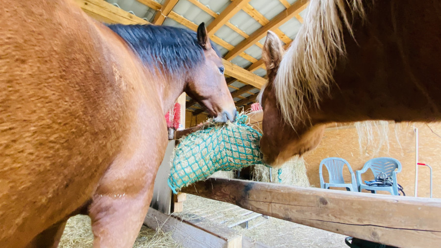 Je reviens par ici (désolée double post). On a donc mis en place les filets à foin. Au départ et pour pas frustrer de trop on est parti sur 2kg foin/100kg de poids. Et ça se gère pas mal. Ils ont un filet de 10kg le matin à 8:00, un autre vers 14/15h et le dernier a 20:00 pour la nuit.