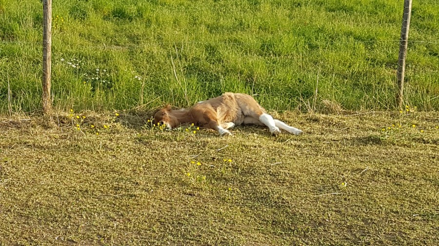 Bébé m'en a fait une belle aujourd'hui, il s'est endormi sous les clôtures, a du se réveiller de l'autre côté et s'est retrouvé avec Faline la 2eme ponette gestante, du coup maman a tout casser lol. J'étais pas là en plus ! La frayeur en arrivant il était comme ça, en fait il se faisait juste dorer la pilule lol la trouille que j'ai eu..