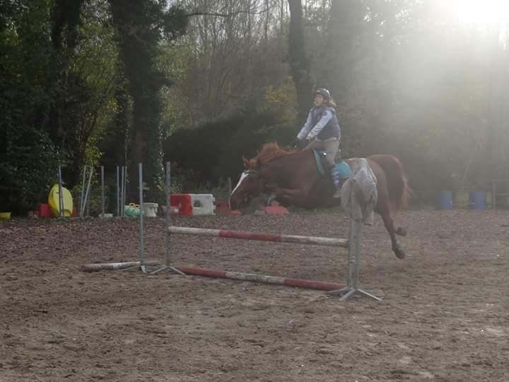 Je commence à détendre en carrière pendant qu' Alice prépare un parcours. Mais elle se rend vite compte qu' il n'y a que 6 barres. Et 1 barre cassée en 2. Elle arrive tout de même à placer 5 obstacles dont un directionnel avec la barre cassée. Je détend sur un vertical au trot.Ya pas à dire, Saphir est chaud bouillant Mdr ! On est obligées de brancher les rênes sur les alliances du releveur. On enchaîne sur un double au galop. Ça passe juste, car Saphir a du mal à se redresser. Alors qu' il y a 5 foulées. Mais bon faut se réadapter à la nouvelle carrière qui est totalement différente de celle d'avant, aux nouvelles couleurs de barres et chandeliers...