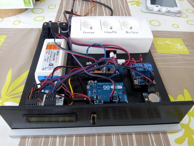 Eclairage à LED avec ambiance lunaire au coucher du soleil (LED bleu), allumage et extinction progressifs avec une électronique maison qui gère aussi le chauffage et un ventilateur en surface pour refroidir quand il fait trop chaud (je me suis amusé...).