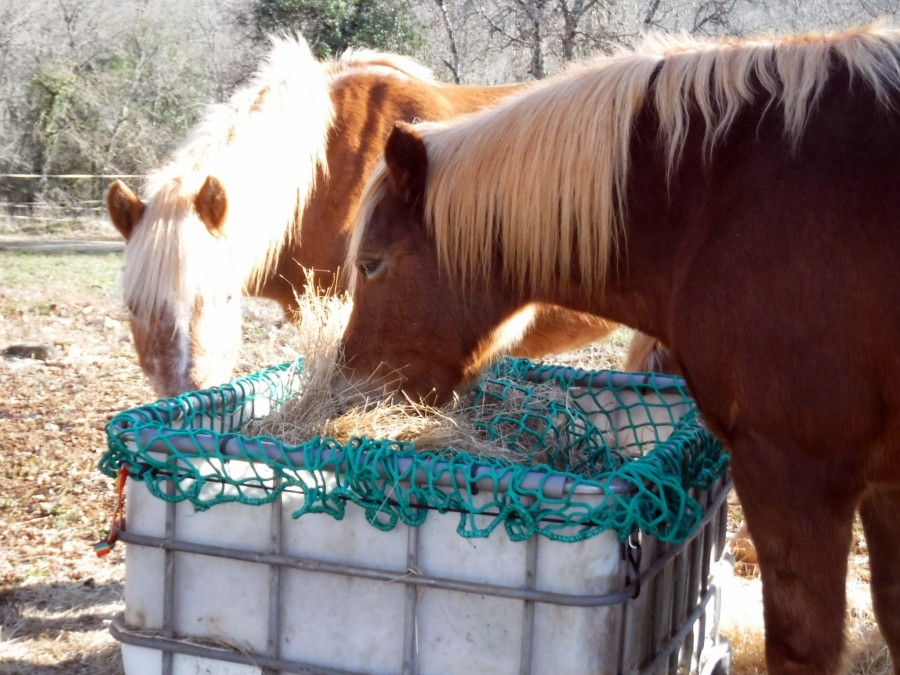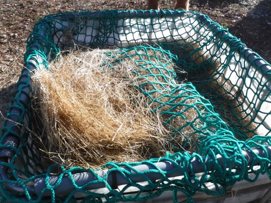 Quand je suis revenue pour mettre le filet , tout le foin était hors de la mangeoire, je remet une grosse partei, je mets le filet et le reste au dessus . Et ils ne mangent pas, boudent le foin