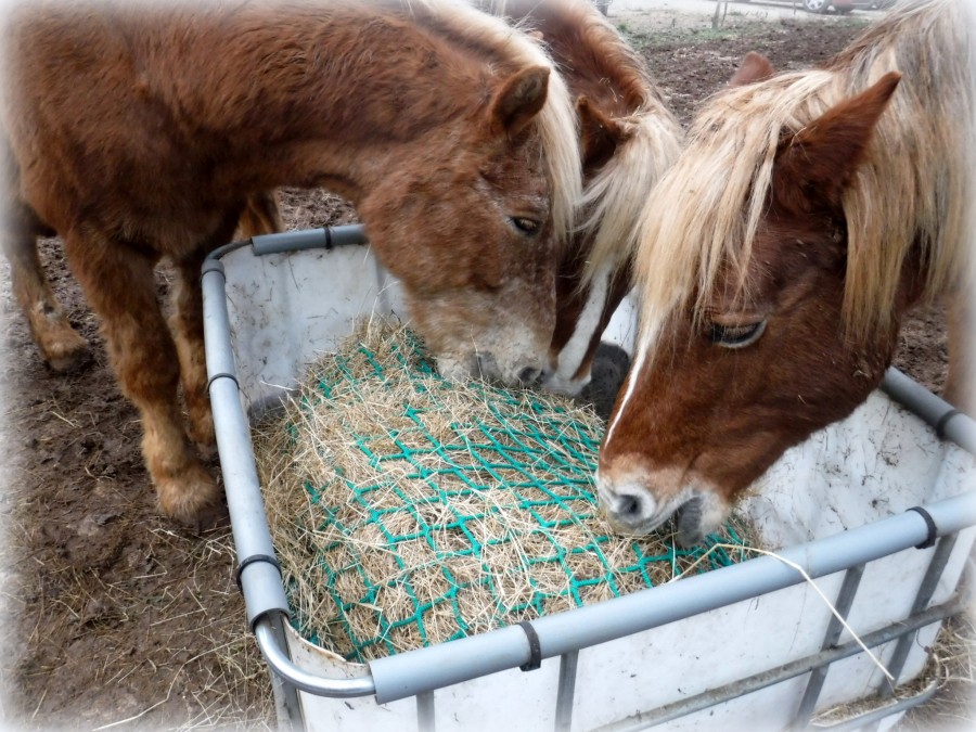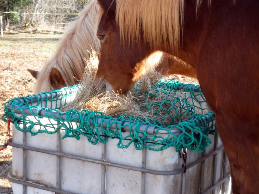 Je crois qu'ici le problème vient surtout du fait qu'effectivement le filet n'est pas tendu sur le foin. Mon mangeoire est un cubit palette de 1000 litres coupés, et j'attache le filet par dessus.