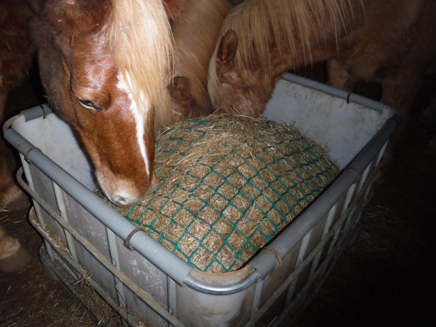 en ce moment ma jument (qui est en pension rentre pour la nuit ) je lui mets un filet a petite maille (heunetz ,mais c'est le même principe et il n'y a pas de "noeuds" qui peuvent parfois blesser les gencives parait -il ?!)