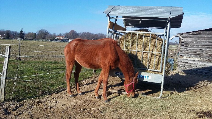Seulement voilà, auparavant, il était au box (3 rations de foin et 1 de granulés par jours), et dans sa nouvelle pension, il est au pré h24, foin à volonté et floconnés le midi. Dans l'optique de lui faire reprendre de l'état son nouveau régime à l'air de fonctionner.
