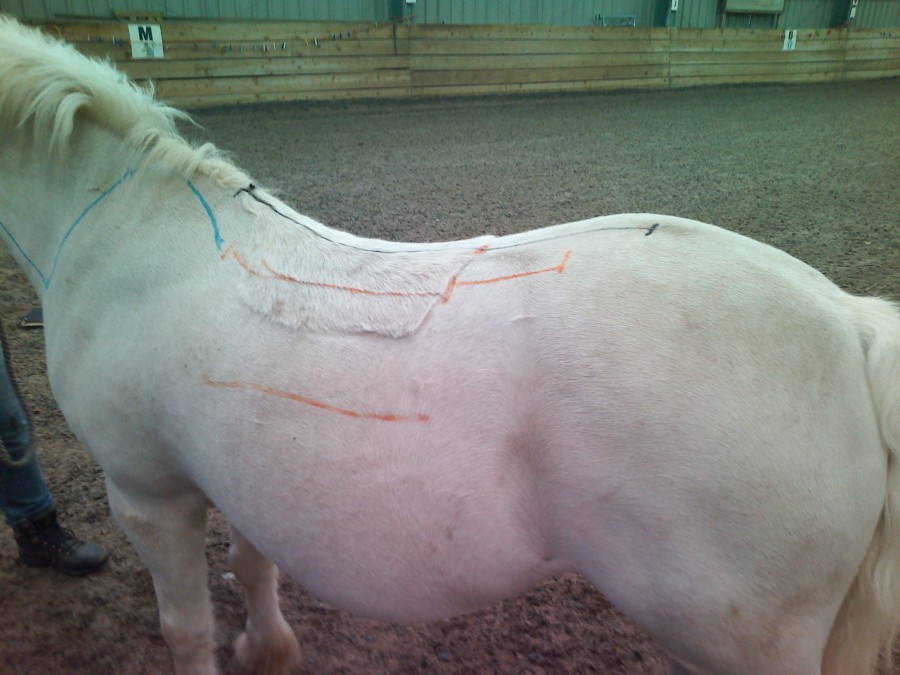 On a fait chacun un cheval par jour (et tous les jours une démo de Jim ) ;la chose nouvelle etait l'evaluation du cheval pour trouver les endroits "sensibles" et le check-up des pieds et jambes pour voir s'il y avait des sensibilités ou raideurs au niveau du genou et boulet des anterieurs et grasset et boulet des posterieurs ...