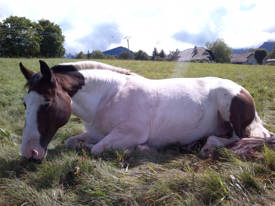 Et à un moment, j'étais en train de travailler à droite, sur la sacro illiaque je crois, je remarque qu'il transpire toujours, malgré le calme et la fraicheur qui tombe, et même pire que ça, il transpire de plus en plus, il avait une bande de sueur à mi cuisse du côté droit. J'étais hyper étonnée, je me suis dit qu'il fallait que je vienne vous demander :p ça vous est déjà arrivé un cheval qui transpire pendant un massage? Je précise qu'il était calme, mais relâchait de toutes évidences beaucoup de tensions.