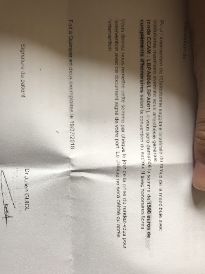 Je sors de chez le chirurgien, voilà son courrier à mon ortho. Donc pour lui la mâchoire du bas n’est pas si en avant que ça. C’est surtout la mâchoire du haut qui est trop en retrait, du coup ça accentue l’immoression Que ma mâchoire du bas est en avant!
