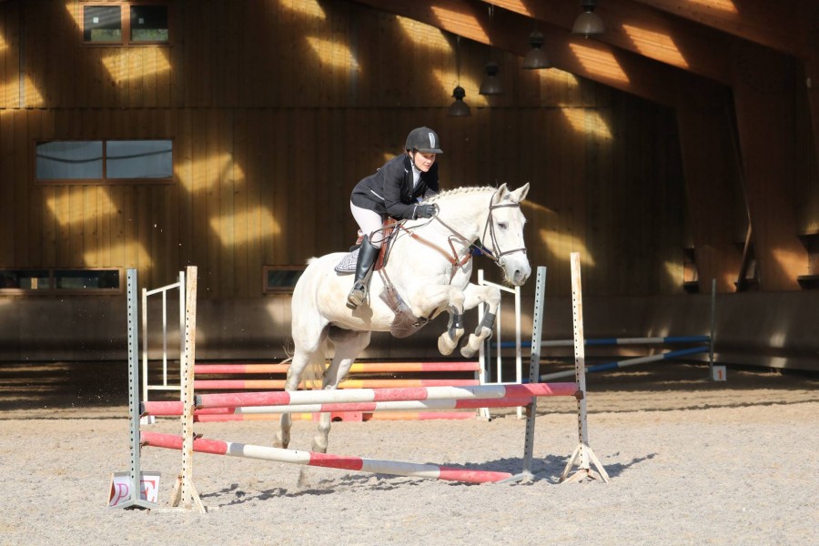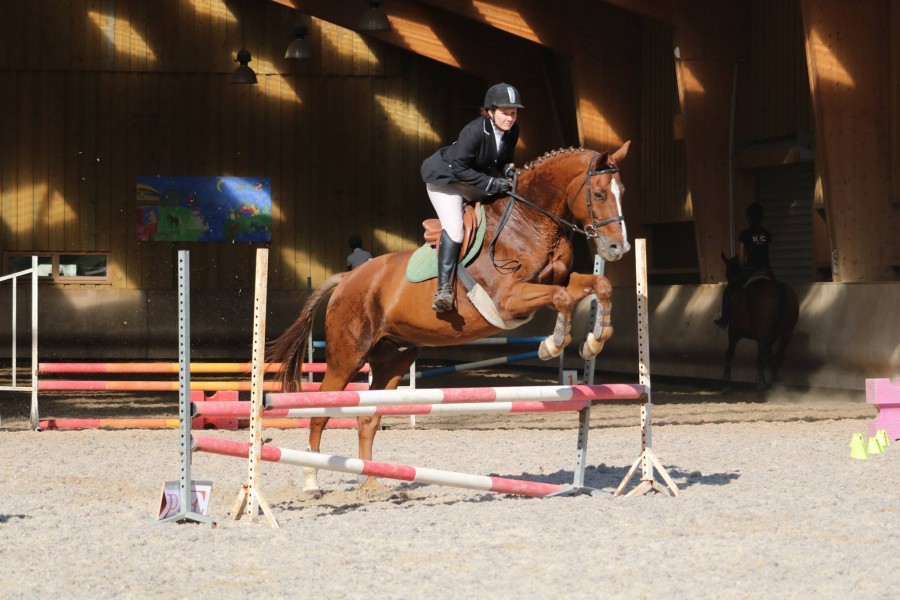 Je démarre avec Osiris. Poney serein jusqu'à l'arrivée dans la carrière. Il reste gérable sur la détente et les premiers sauts, saute bien, regarde pas trop la sono. Les autres partent. Drame dans sa tête. J'ai quelques minutes le temps que le jury arrange les protocoles, je galope, je chante, j'essaie d'être sereine pour 2
