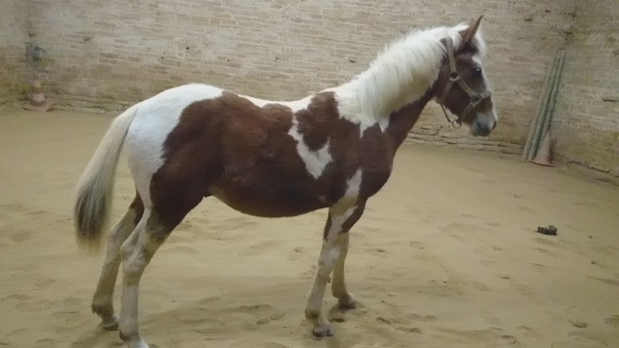 Le vétérinaire a noté bai comme couleur de base, mais pie overo.