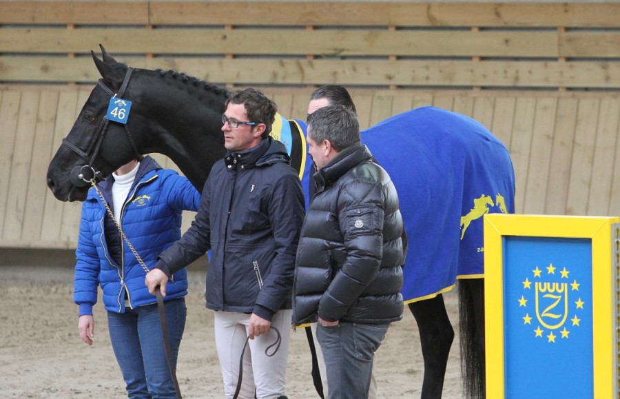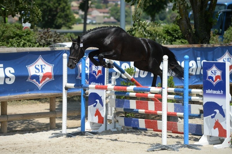 "C’est Divin du Boisset SF qui monte sur la deuxième marche du podium avec une bonne moyenne de 15.69/20. Ses notes sont très bonnes dans les différents ateliers (16.12 au Saut en liberté et 15 au Modèle) mais il impressionne encore davantage aux Allures, épreuve à laquelle il récolte un 16.5, meilleure note de sa section. Le très beau mâle noir à la belle silhouette nous vient de l’élevage de PIERRE-BENOIT VAGANAY, situé dans le Rhône à St Jean la Bussière. Celui-ci a pensé à allier Goldfever et Valesca par Darco pour que Divin naisse."