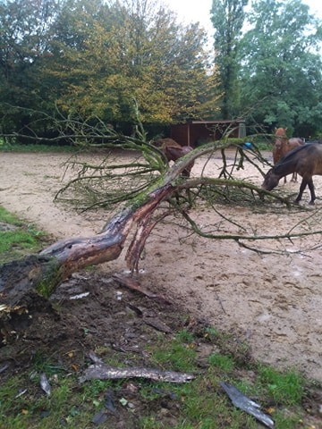 Petite surprise ce matin Le chevaux se régalent avec la mousse , heureusement que l'arbre n'est pas tombé sur eux.