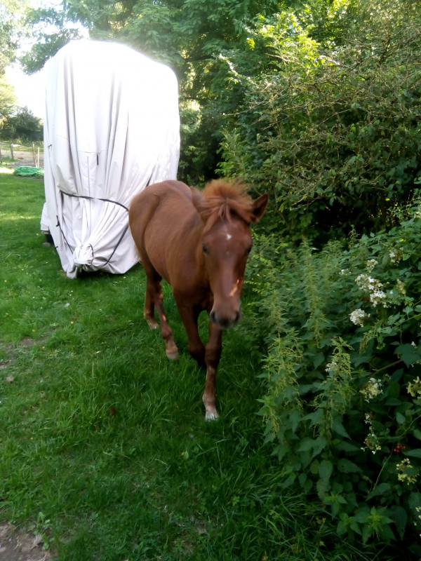 Vikki m'inquiète un peu. Sa toux persistante s'est envolée comme par miracle quand je l'ai remis à l'herbe. Ça confirme donc mon soupçon, que c'est le foin qui en était la cause. Je pensais opter pour de l'enrhubanné, mais malheureusement ça ne semble pas être trop adapté à nous. J'ai commencé un traitement homéopathique pour elle, mais je doute que seul ça ne sera pas suffisant. Et par ici herbe à l'année, ce n'est tout simplement pas envisageable.