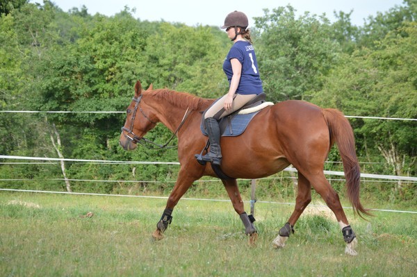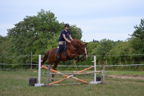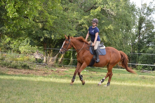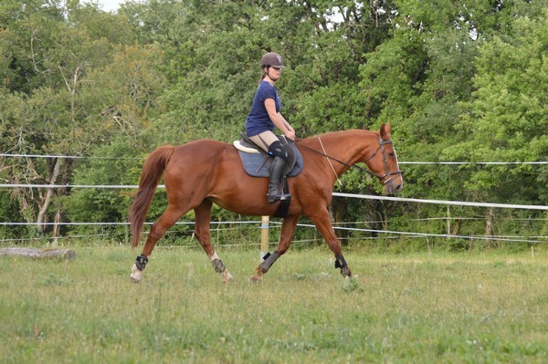 Première croix. Elle me sauve bien. En même temps, c'était prévisible. Bon, je n'ai pas une position si pourrie que ça, mais j'arrive pas à lâcher prise, je reste bloquée... Une deuxième fois, légèrement mieux. On change de main. Mon amie me dit d'y aller au galop. La jument part d'elle-même, en mode "On y va, t'inquiète, je gère". Ok Lorette, bah gère alors