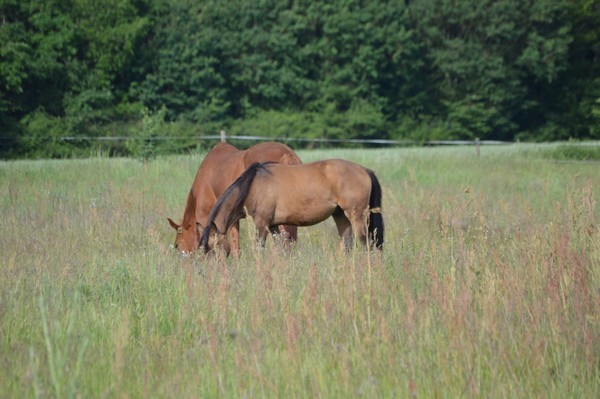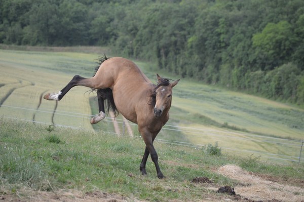 Je l'emmène brouter la bonne herbe verte. Il tire légèrement, mais rien de méchant. Ca me va ! Puis, mon amie sort de chez elle pour aller chercher les trois autres. Et là, c'est le drame... Dès qu'il l'a perdue de vue, il a commencé à être juste affreux, à tirer comme un con, à lever les antérieurs. Je voulais le remettre dans le pré, je n'ai pas pu. Je me suis fait "trainer" jusqu'à l'autre pré (où étaient les autres), entre levades et ruades... J'arrivais à l'arrêter, mais je savais très bien que je ne pouvais pas faire demi-tour. C'est pleins de choses qui se sont passées dans ma tête "Je vais le vendre", "Je n'aurais pas du prendre un poulain". Aujourd'hui et pour la première fois, mon cheval m'a fait peur, très peur. J'étais persuadée qu'il allait finir par me trainer ou me taper. Pour la petite histoire, je me suis fait botter par une jument l'été dernier, et j'en garde quand même quelques méfiances du coup... J'étais au bord des larmes. Pourquoi tout ça ? Je ne sais pas. On a fini par rejoindre les autres au pré. Puis là, toute la pression est redescendue de son côté. Il est donc rentré derrière les autres, tranquillement. Je l'ai remis au pré, et je me suis assise regarder mon amie monter Lorette. Je voulais pas retourner le voir ce soir, vraiment pas...
