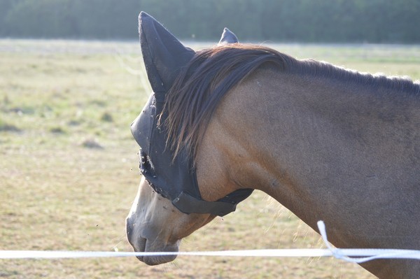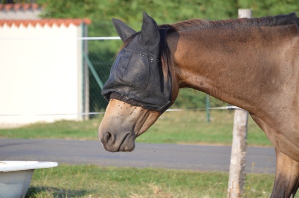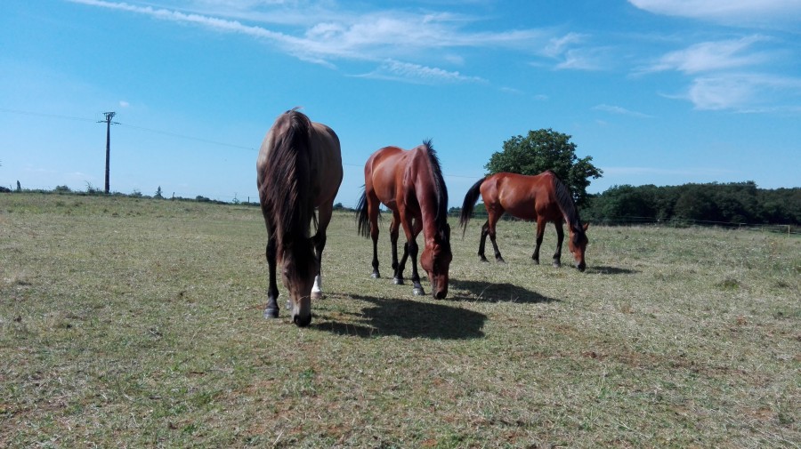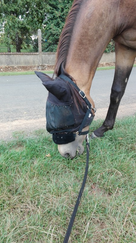 J'arrive au pré, ils sont tous les deux au filets à foin, chacun d'un côté du pré. Etant plus près de Flash, je commence par le récupérer. Je lui mets le licol, tourne la tête et vois l'autre nouille s'éloigner encore plus... Comme le pré est organisé en paddock paradise et que je n'ai pas coupé le courant, je ne peux même pas passer à travers. Donc j'ai fait le tour du pré avec Flash avant d'attraper Coup d'Etat. Si ça avait été la seule difficulté, je ne me plaindrais pas. Mais après, il n'y en a pas un pour rattraper l'autre. Ils s'arrête chacun à leur tour tous les deux mètres. J'ai peut être mis un quart d'heure avant d'arriver à la porte du pré, où j'ai faillit craquer et appeler mon amie au secours. Finalement, une fois sortis du pré, plus de problèmes pour avancer côte à côté. Flash en a juste profiter pour mordre Coup d'Etat. Donc je l'ai gardé bien près de moi plutôt que derrière.