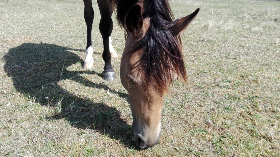 Une fois que je m'en suis sortie, j'attache Coup d'Etat et mets Flash au pré. Les retrouvailles faites, je m'occupe du grand. Pendant que je le brosse, je tourne la tête vers le nain, que je vois le nez dans la pierre à sel. C'est vrai qu'ils n'en ont pas dans leur pré... J'en reparle plus tard. J'ai croisé le maréchal de Coup d'Etat, qu'il jette un œil à ses pieds (c'est le mari de la proprio de Tortilla). Puis, nous voilà partis en balade avec le vieux Zazouille.