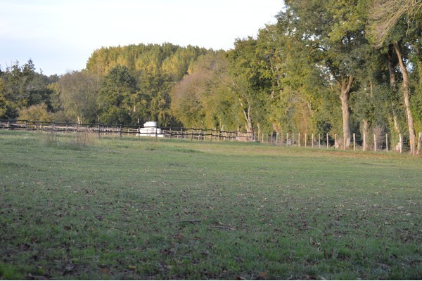 La gérante s'arrête devant le pré pour qu'on discute un peu de cette première nuit. Elle nous dit qu'un des chevaux a du dormir couché dans l'abri, et en effet, on voit qu'il y a un espace bien tassé.
