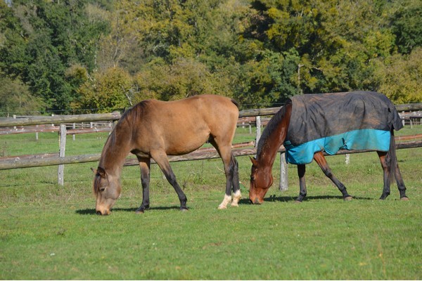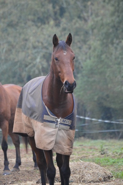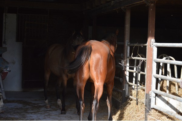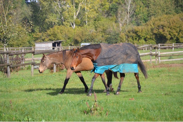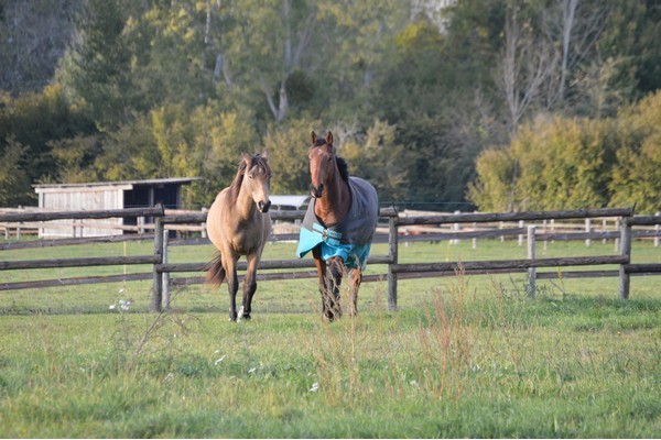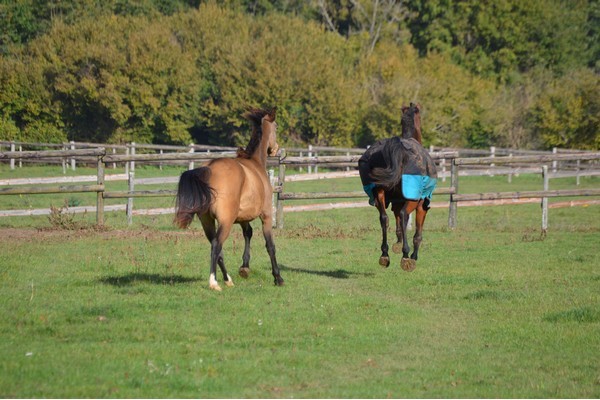 On s'est rendues au pré pour la ration du soir. On les a d'abord sorti pour aller dans l'écurie afin de faire un petit pansage. Des chevaux avec la bougeotte, un peu inquiets. Flash est vite descendu, ça a été plus long pour Coup d'Etat mais rien d'étonnant, c'est un émotif. smile: Après, tant qu'on a le respect, nous on s'en fiche qu'ils mettent du temps à devenir zen. Après avoir vérifié les pieds des deux, on les a emmené faire un petit tour des prés en passant par la piste en sable. Que de souvenirs pour le galopeur