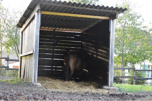 Puis, à 17h, on a distribué les rations. D'abord le grand, pas de souci. Flash a suivi dans l'abri sans problèmes non plus. Il est juste sorti nous rejoindre à la porte, inquiet. Je lui ai passé le licol et suis retournée avec lui dans l'abri le temps qu'il termine. Il a besoin d'être rassuré par sa maman.