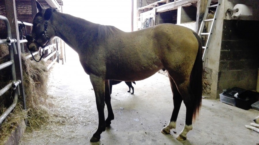 On rentre dans l'écurie. Je l'attache au niveau du foin des vaches, et il ne tarde pas à se mettre à table.