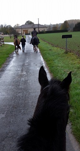 J'ai décidé de le sortir jusqu'à l'écurie pour un pansage. Cela a donc impliqué une "séparation" avec Coup d'Etat. Sorti du pré, il m'a devancé une fois comme le grand zozo galopait derrière la haie. Le stick l'a remis à sa place tout de suite. Hors de question de me laissée déborder. Sur le reste du chemin, il a été calme. Inquiet, mais calme. Nous arrivons dans la cours de l'écurie, et je vois des flaques, assez grosses pour passer dedans. Je n'ai jamais eu l'occasion d'emmener Flash dans des flaques d'eau, donc j'en ai profité. Et c'est passé comme si de rien n'était.
