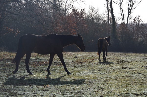 Ensuite, je me dis que ce serait bien qu'il s'approche des râteliers. On y va pas à pas, il me suit. On prend le temps, et on finit par arriver au râtelier de libre. Il ne perd pas de temps pour choper le foin. Je reste un court instant à côté de lui avant de m'éloigner. Le hongre débarque quelques instants après et le chasse, mais tout se fait dans le calme, au pas. Je préfère ça que le voir charger au galop. Retour donc à la case départ. Je reviens vers Flash, et le ramène une nouvelle fois au râtelier (en liberté tout ça). Les autres le regardent, mais ne disent rien. Je m'éloigne, de plus en plus. Je finis par aller attendre à la porte (à l'autre bout du pré). J'attends quelques minutes : toujours rien. Donc je me décide à partir, et je verrais cet après midi ce qu'il en est.