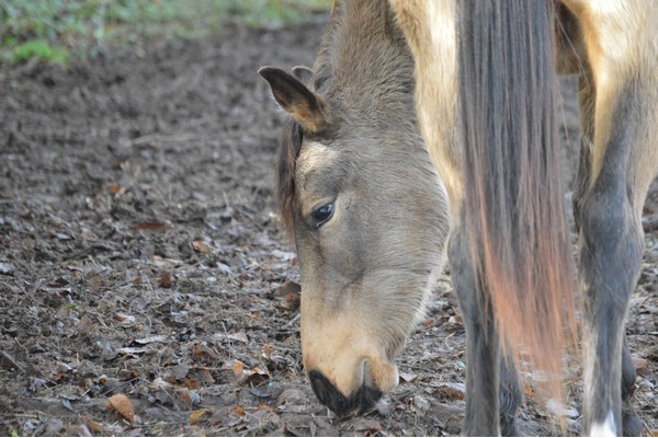 J'éteins la tondeuse, félicite. Ok, maintenant, on passe à la tête. Oh zut, la tondeuse ne s'allume plus... Tant pis, je caresse fort mon grand poulain et je pars chercher son goûter du jour. Je prépare tranquillement, et je l'entends s'impatienter. Au menu aujourd'hui : 1/2L de son, des carottes, des pommes, et du sucre. Je vous laisse imaginer sa joie quand il m'a vu débarquer avec un seau.