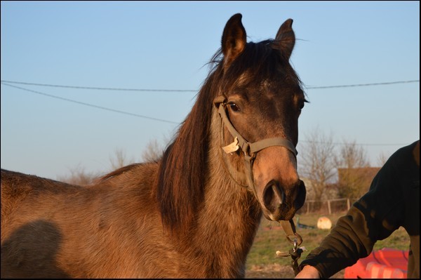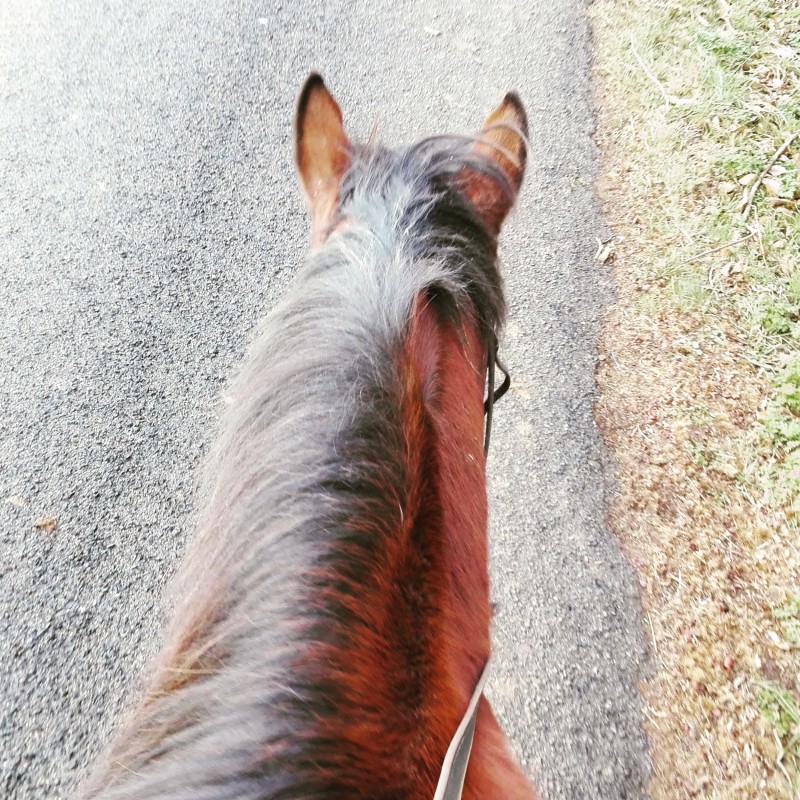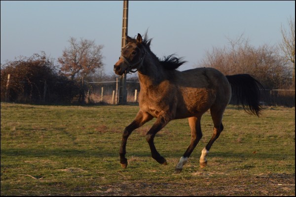 Je lui ai demandé un trot, il m'a fait un super départ, mais je n'ai pas été assez rapide. Il est quand même super sympa parce qu'il est repassé au pas dès qu'il a senti la tension sur la longe. Sa propriétaire est un boulet, le pauvre...