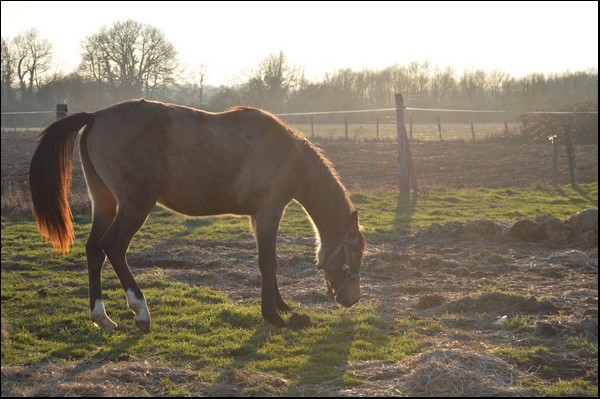 Je lui enfile son licol éthologique, et en route ! Petit arrêt à ma voiture pour que j'enfile mes voitures et ça y est, on y va. Eh non, toujours pas... La gérante vient nous parler, donc je cède le droit de brouter à Flash parce que je sens bien qu'il perd patience. Et finalement, à peine parties que j'ai la flemme de faire le tour d'une heure (les courbatures d'hier ne me motivent pas) donc on part dans le bois. Flash est vraiment un amour. Il est devant, respectueux, attentif. Que demander de plus ? On fait demi-tour dans le bois, il se retrouve derrière, et il commence à s'y faire. Toujours aussi calme et respectueux, alors qu'avant j'avais plus tendance à me battre avec lui quand il n'était pas devant... C'est que ça vient, c'est chouette.