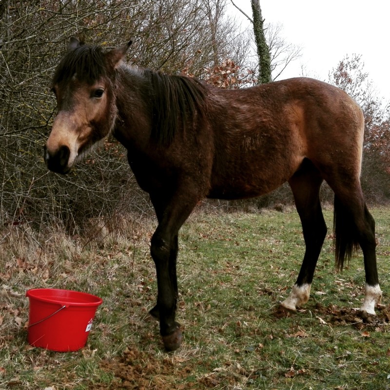 Pour finir cette journée, j'ai amené la ration aux garçons. Le mari de la gérante nettoyait les tracteurs à côté du paddock, donc beaucoup de bruit, ils ne m'ont pas entendu brasser les seaux. Je me suis approchée, Coup d'Etat a fini par venir, et le nain est resté le nez au foin. J'ai dû l'appeler peut être deux minutes avant qu'il réagisse.