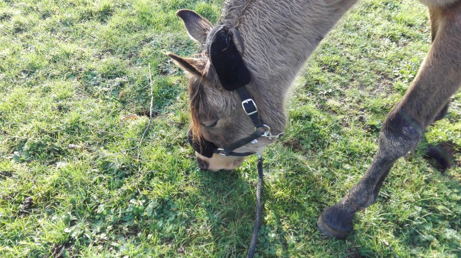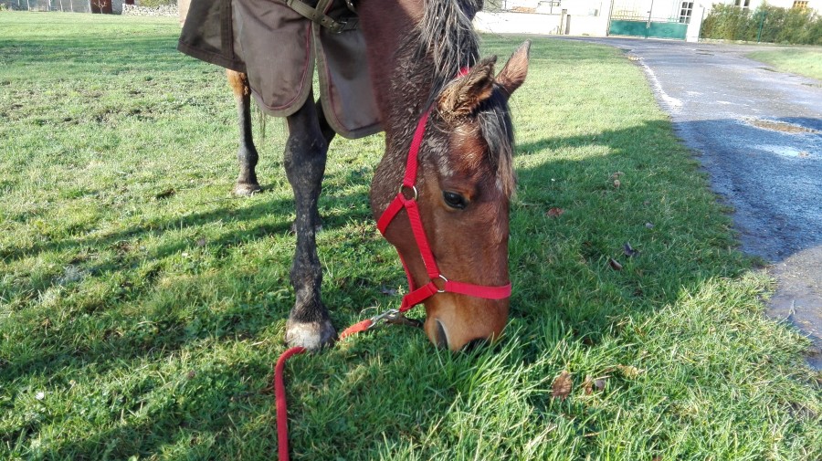 Brouting pour Monsieur, qui ne se fait pas prier. Je l'ai juste pris à un moment, Jeanne voulait que je lui montre comme j'allais aborder les aspirations. Ca a été très compliqué pour Flash ! Il cède parfaitement quand je pousse les hanches mais là, les amener vers moi a été difficile. Donc j'ai énormément récompensé dès que j'ai eu un pas et l'ai laissé se remettre le nez dans l'herbe. On travaillera ça plus tard.
