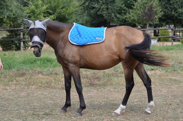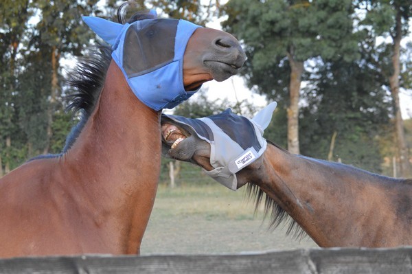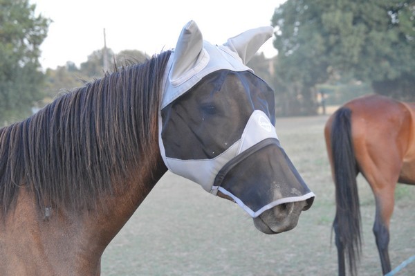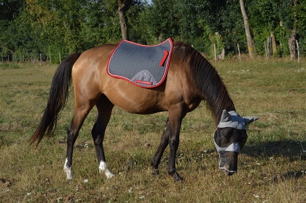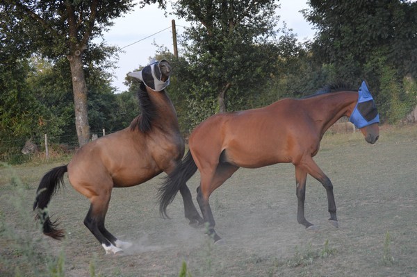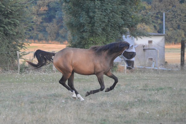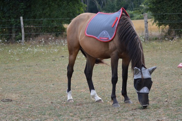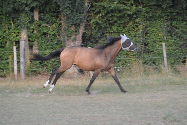 J'arrive au pré, je l'appelle. Il est tout seul (Tac est parti en balade), au fond. Il relève la tête. J'ai le droit à un énorme hennissement plein de soulagement, et il vient me voir tranquillement au pas. Miracle, il a encore son masque sur la tête, depuis hier