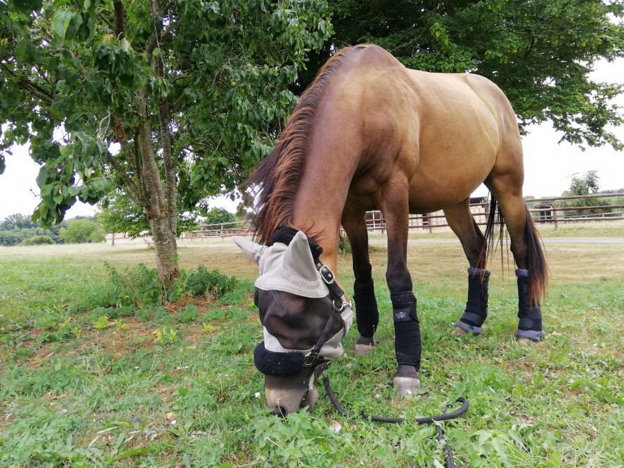 On va marcher en direction de la piste pour qu'il puisse brouter. Il n'arrive pas à se poser pour brouter malgré son calme olympien, donc je décide de l'emmener dans le carré d'herbe. C'est bon, il marche complètement normalement. Je le laisse brouter dix petites minutes avant de l'emmener dans l'écurie pour lui enlever les protections. Il y retrouve Coup d'Etat au passage. Je décide de tenter de rouler les bandes directement en les enlevant, sans aucune difficulté. Vraiment exceptionnel mon nain