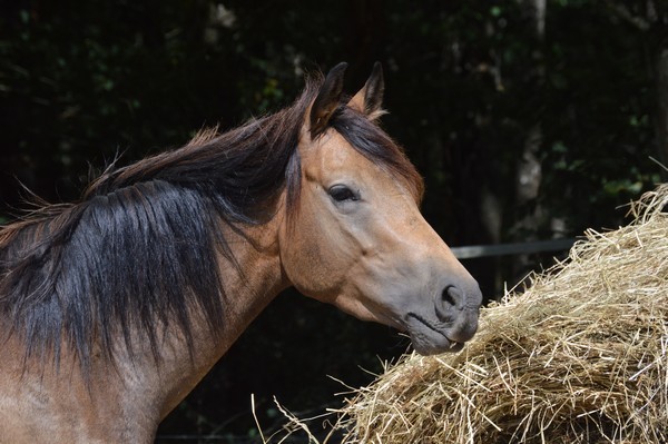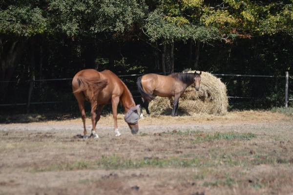 J'y suis retournée en fin d'après midi avec des carottes, il était dans l'abri. Je le sens déboussolé, ce qui est normal. Il s'agite de la tête aussi, donc je décide de lui remettre son masque à mouche. Je ne lui avais pas mis en arrivant pour qu'il découvre clairement son pré. Et finalement, ils sont toujours chacun à un bout du pré. Ils alternent entre cabane et foin. Quand ils comprendront l'un comme l'autre qu'il n'y a pas de méchant, ça devrait le faire.