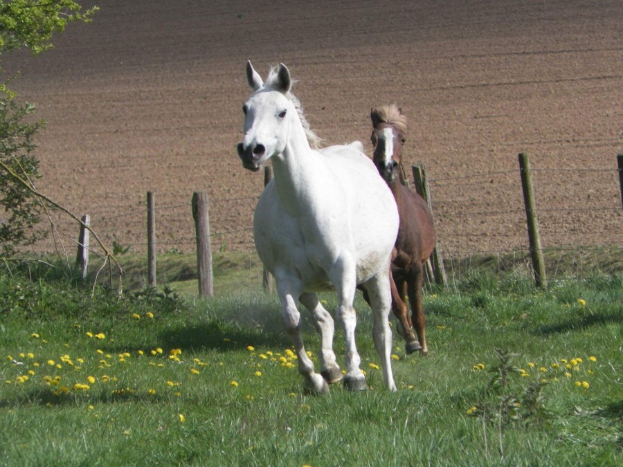 Coucou ! Je suis déjà dans le post des poulains pour 2017 ! Mais j'avais envie de faire un post pour mes 2 fifille prévues toutes les 2 pour juin ( je n'ai 2 poulains la même année que rarement er surtout pas aussi proche ( ma ponette est à terme le 21 juin et mon arabe dans le 25 juin ) ! C'est très long lol donc se post m'aidera à patienter lol ! Le papa est mon jeune étalon arabe sh favori , se seront ses 2 premiers poulains de lui , donc un demi sang arabe et un pur sang arabe ( d'après le test du clou , le dsa sera un mâle et le pur sang arabe une femelle on verra hein lol ) ! Première photo ma jument arabe , la deuxième ma ponette ( lorsqu'elle était pleine de son poulain né en 2014 ) et la troisième mon étalon arabe , et les autres photos sont des photos récentes de leurs ventres ! Ma ponette est donc à 7 mois et demi et mon arabe à 7 mois et 9 jours Cliquez pour voir l'image