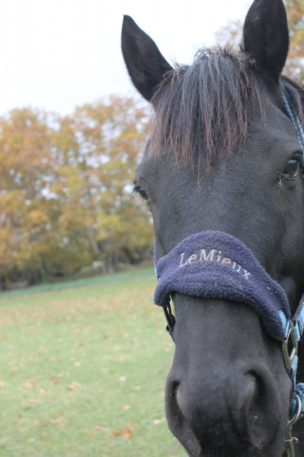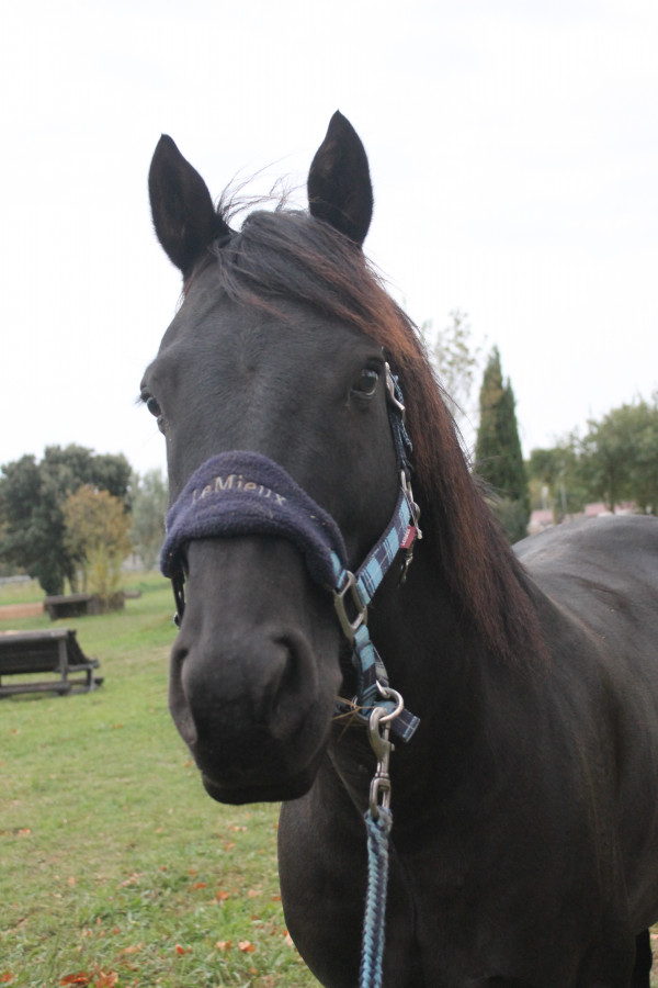 Avant d'arriver à la maison, il a vécu 6 ans au pré à se faire cajoler... Un peu trop, du coup il ne connait pas bien les limites avec l'homme. Il a été monté quelques fois, il a du faire 2-3 balades et des changements de pré à cru en licol, mais n'a pas eu un travail "classique".