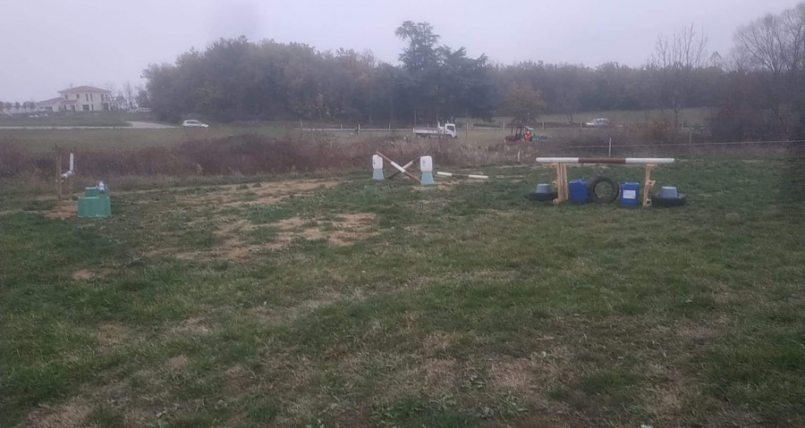 J'avais pris un exo de remise en route de Seaver je crois : entrée au trot, barre d'appel à 2m50, croix, 9m, oxer. On a monté l'oxer à 90cm environ et on a enchainé avec un vertical à 95cm. qu'il fallait aborder après une volte un peu serrée. La première fois je n'ai pas evasé assez donc barre, mais deuxième passage nickel donc laissé la dessus.